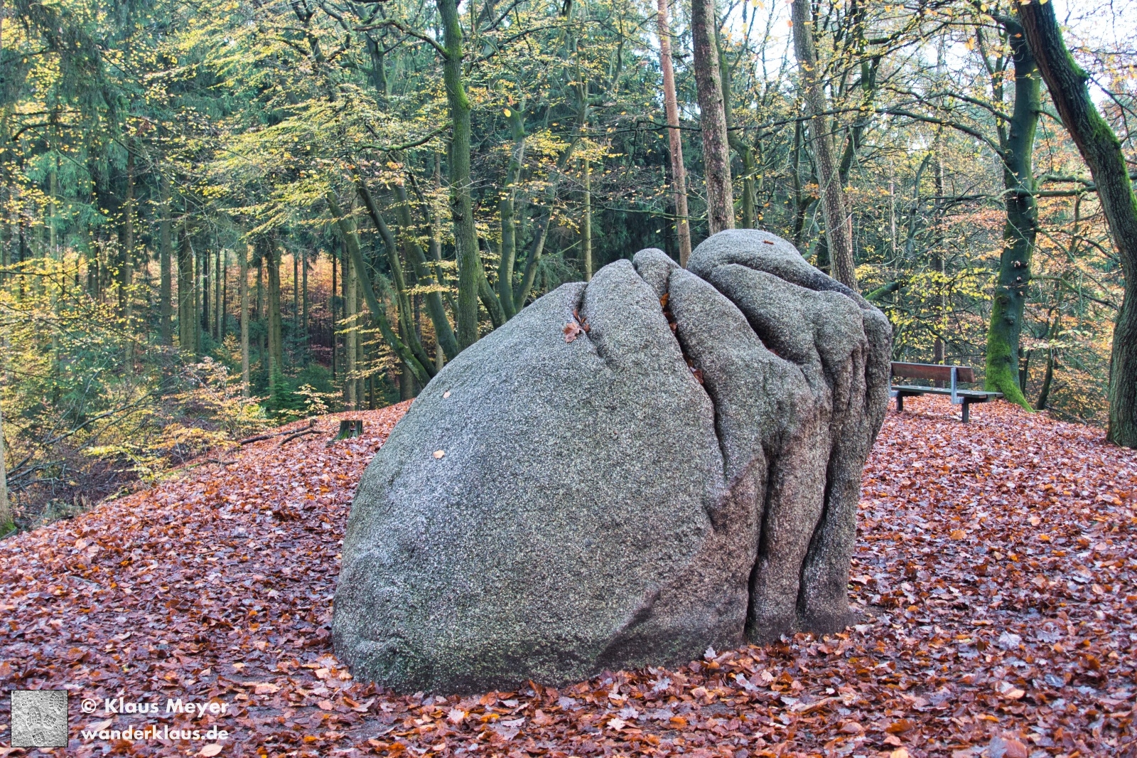 Nach einer Linksbiegung geht es auf eine Anhöhe. Hier treffen wir auf den Karlstein. Dabei handelt es sich um einen großen Findling aus Granit der bei der letzten Eiszeit mit den Gletschern aus Skandinavien zu uns kam. Seinen Namen hat er vom Frankenkönig Karl dem Großen.